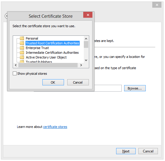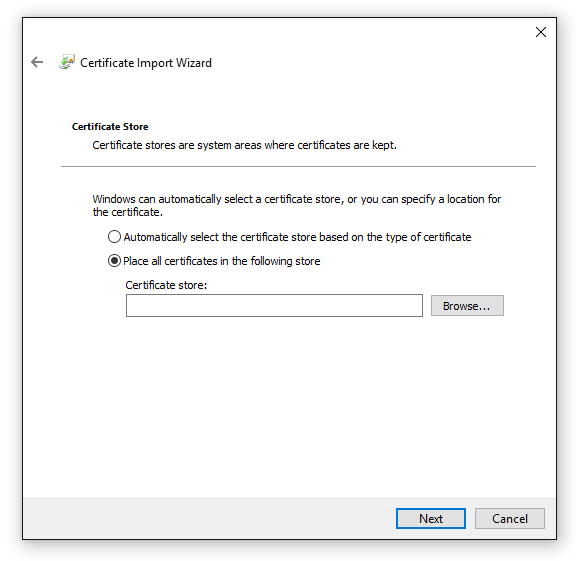 Select the Place all certificates in the following store radio icon, and then click the Browse button