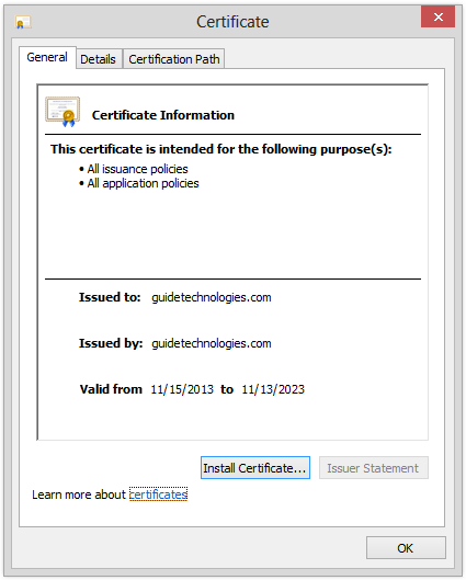 At this point, you can click next all the way to the end of the process. Once you have installed this certificate, you can use custom solutions Guide Technologies has developed for you.